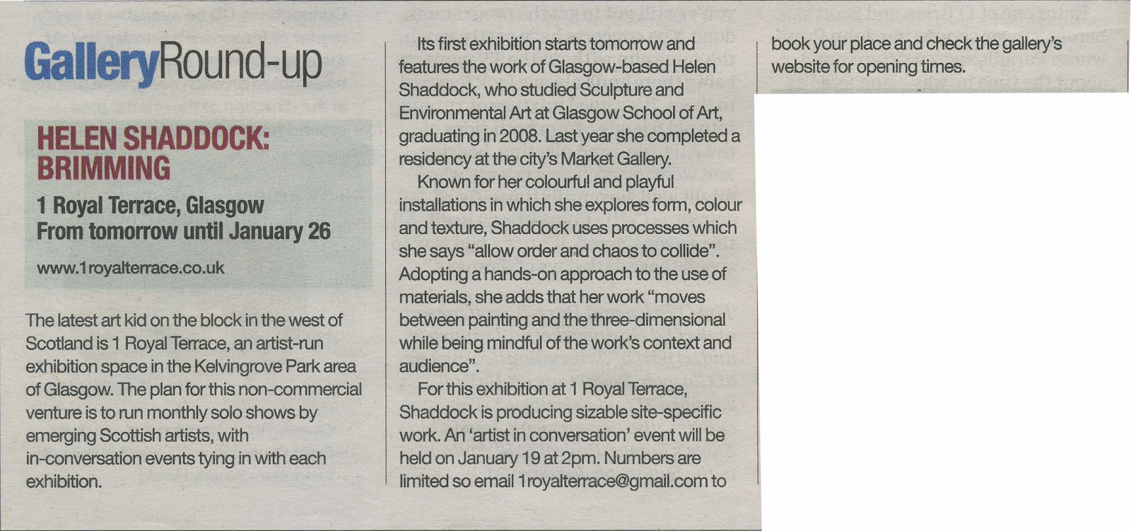 So, I know that my BRIMMING exhibition at 1 Royal Terrace has been and gone, but I've only just managed to get my hands on a copy of the Preview that was printed in The Herald (Scottish newspaper) the Saturday before my exhibition opening on 12th January.